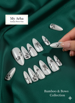 Unveil mesmerizing style with My Arha's "Bamboo & Bows" luxury press-on nails, now with a stunning cat eye finish. Featuring elegant bamboo and delicate bow designs on a shimmery white base, these reusable press-ons offer salon-quality manicures in minutes. The unique cat eye effect adds depth and allure, catching the light with every movement. Perfect for any occasion, discover your next sophisticated aesthetic look. Shop My Arha for durable, beautiful, and easy-to-apply artificial nails that truly stand out.