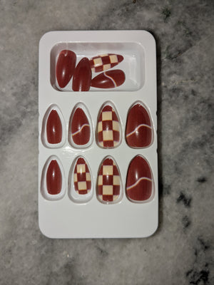 Elevate your manicure game with our Brown & Beige Checkerboard Press-On Nails. This stylish set features a mix of glossy solid tones, retro checker-board patterns, and modern swirl accents—perfect for both casual days and special occasions. Crafted with high-quality materials, these reusable press-on nails offer a salon-quality look without the hassle. Easy to apply, comfortable to wear, and durable enough to last for weeks, they’re ideal for anyone who loves chic, ready-to-go nail designs.