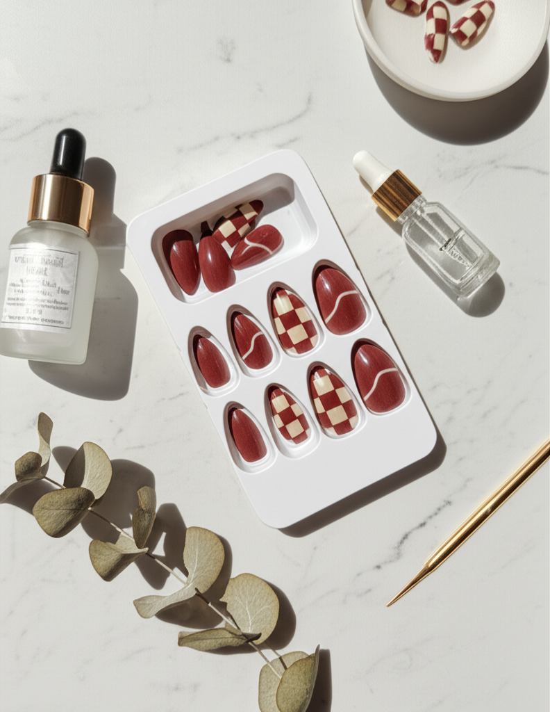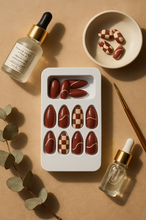 Elevate your manicure game with our Brown & Beige Checkerboard Press-On Nails. This stylish set features a mix of glossy solid tones, retro checkerboard patterns, and modern swirl accents—perfect for both casual days and special occasions. Crafted with high-quality materials, these reusable press-on nails offer a salon-quality look without the hassle. Easy to apply, comfortable to wear, and durable enough to last for weeks, they’re ideal for anyone who loves chic, ready-to-go nail designs.