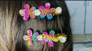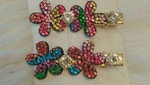 Enhance your hairstyle with these beautiful flower-shaped crystal hair clips. These stylish hair accessories feature vibrant multicolored crystals, offering a perfect balance of elegance and fun. Each clip is adorned with shiny rhinestones that create a dazzling effect, making them ideal for any special occasion or casual styling.