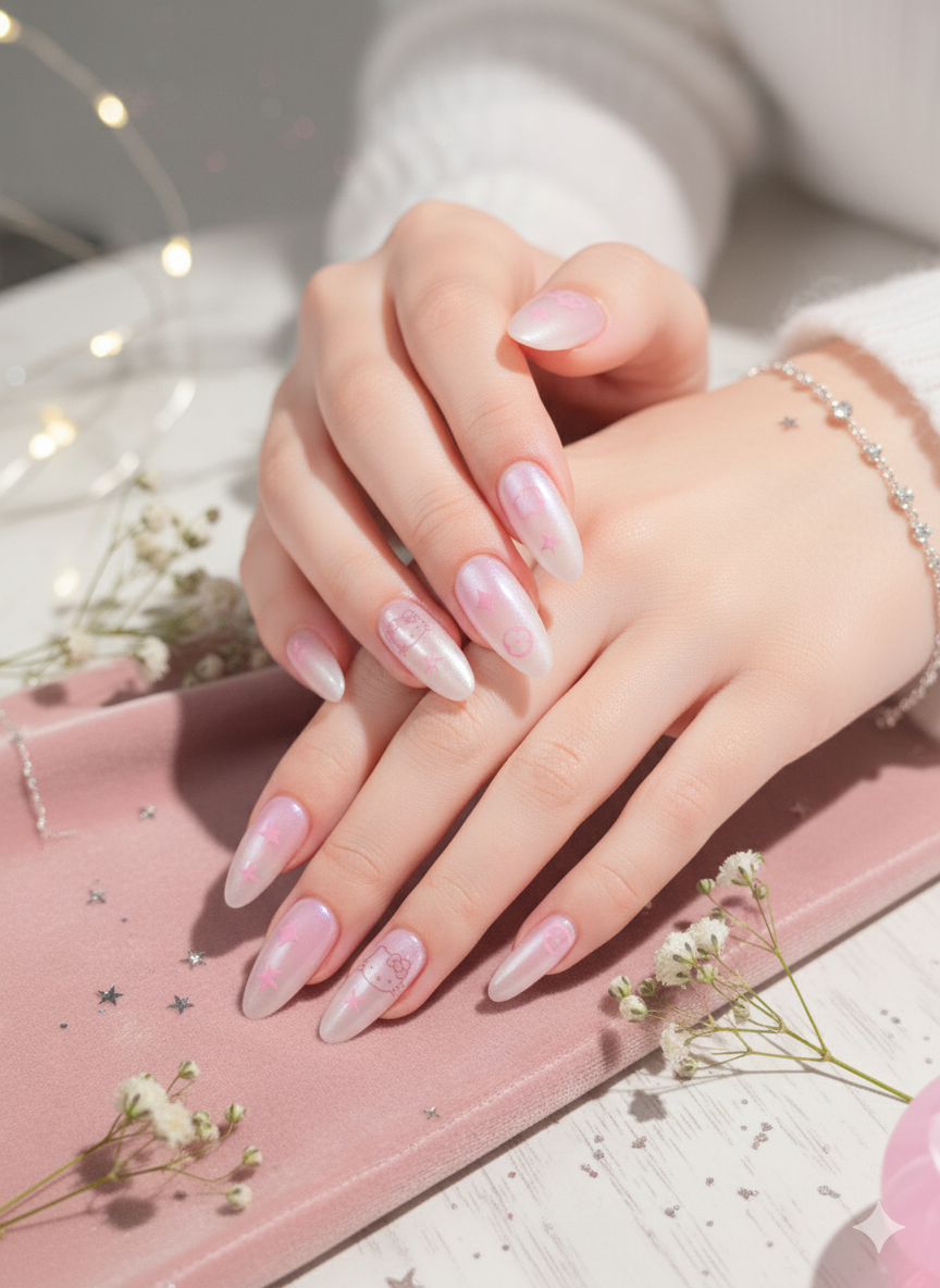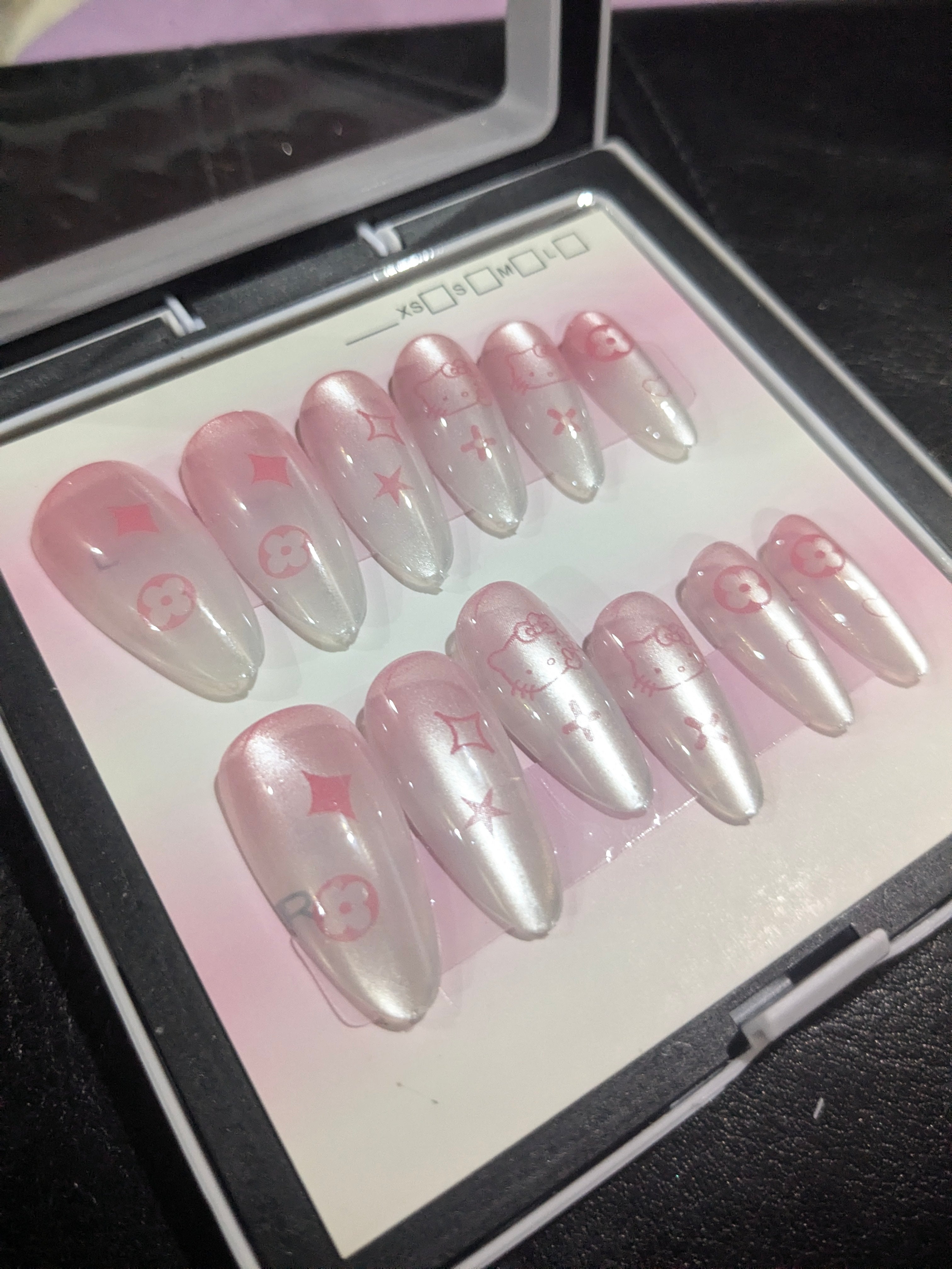 Ultimate Kawaii Aesthetic: Each nail is adorned with adorable, iconic pink accents, including Hello Kitty-style figures, sweet hearts, and twinkling stars. Perfect for channelling a cute, playful vibe!