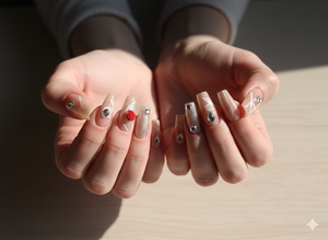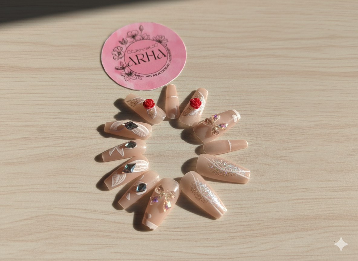 Elevate your style with these stunning embellished nude press-on nails from ARHA. Each nail is designed with intricate white patterns, dazzling gems, and a standout red rose detail, bringing sophistication and sparkle to your fingertips. Ideal for events, parties, or everyday luxury.