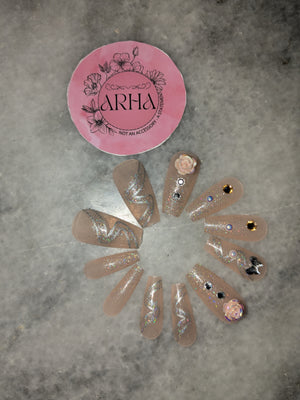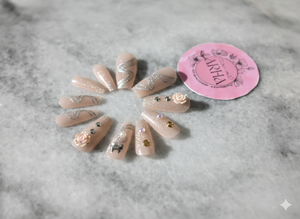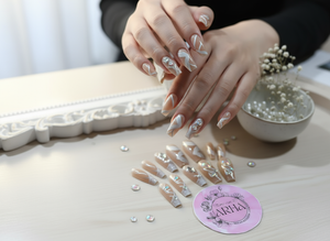 Add playful elegance with our Peach Pink Charm Press-On Nails. Designed with a soft peach-pink base, this set is decorated with silver moon, bow, and star charms, sparkling rhinestones, and subtle white swirl art for a chic and stylish finish. Perfect for everyday glam, parties, or special occasions, these reusable press-on nails deliver salon-quality results in minutes.