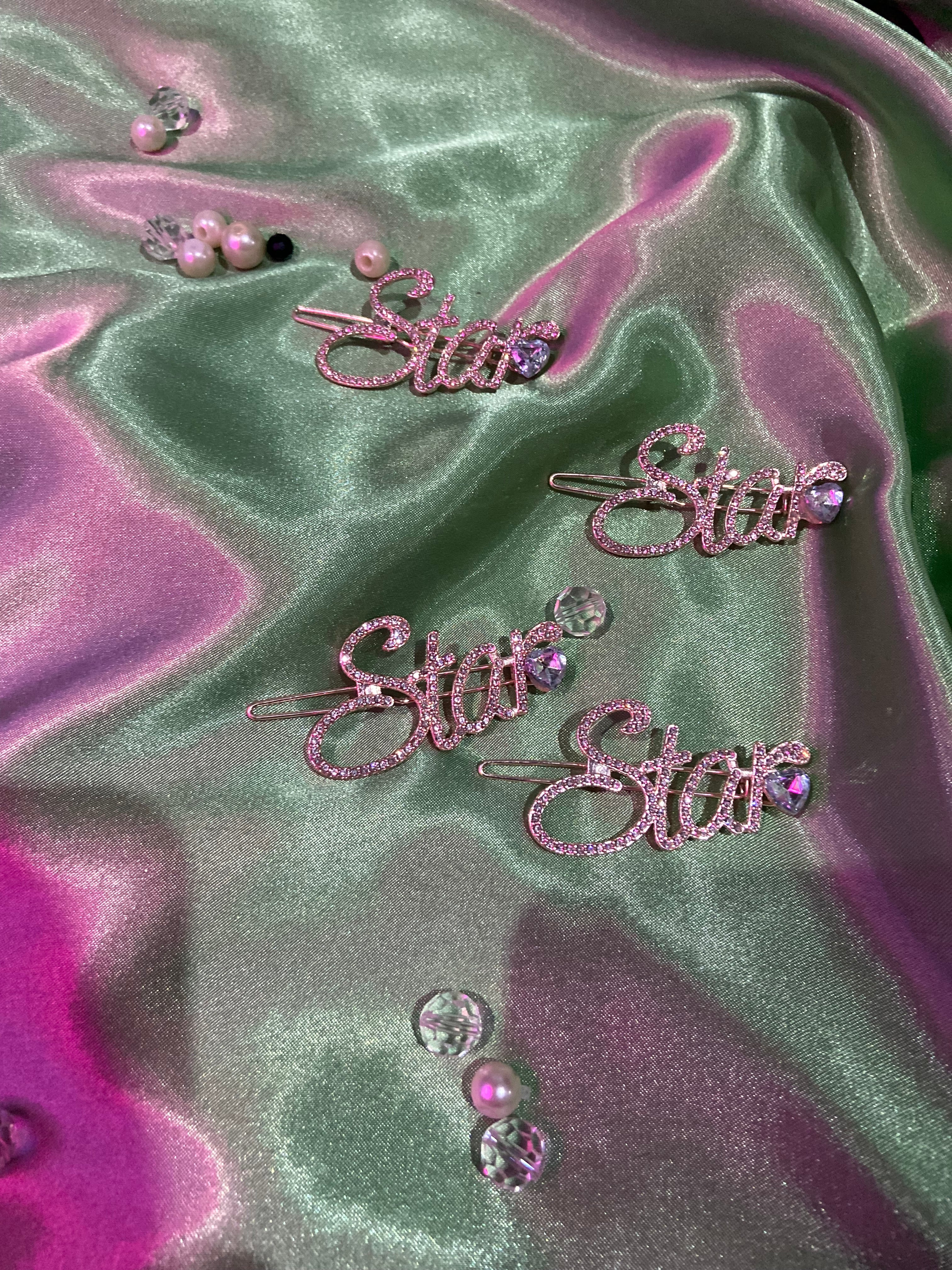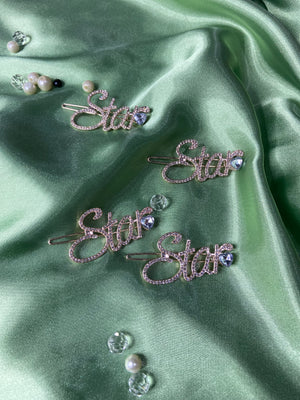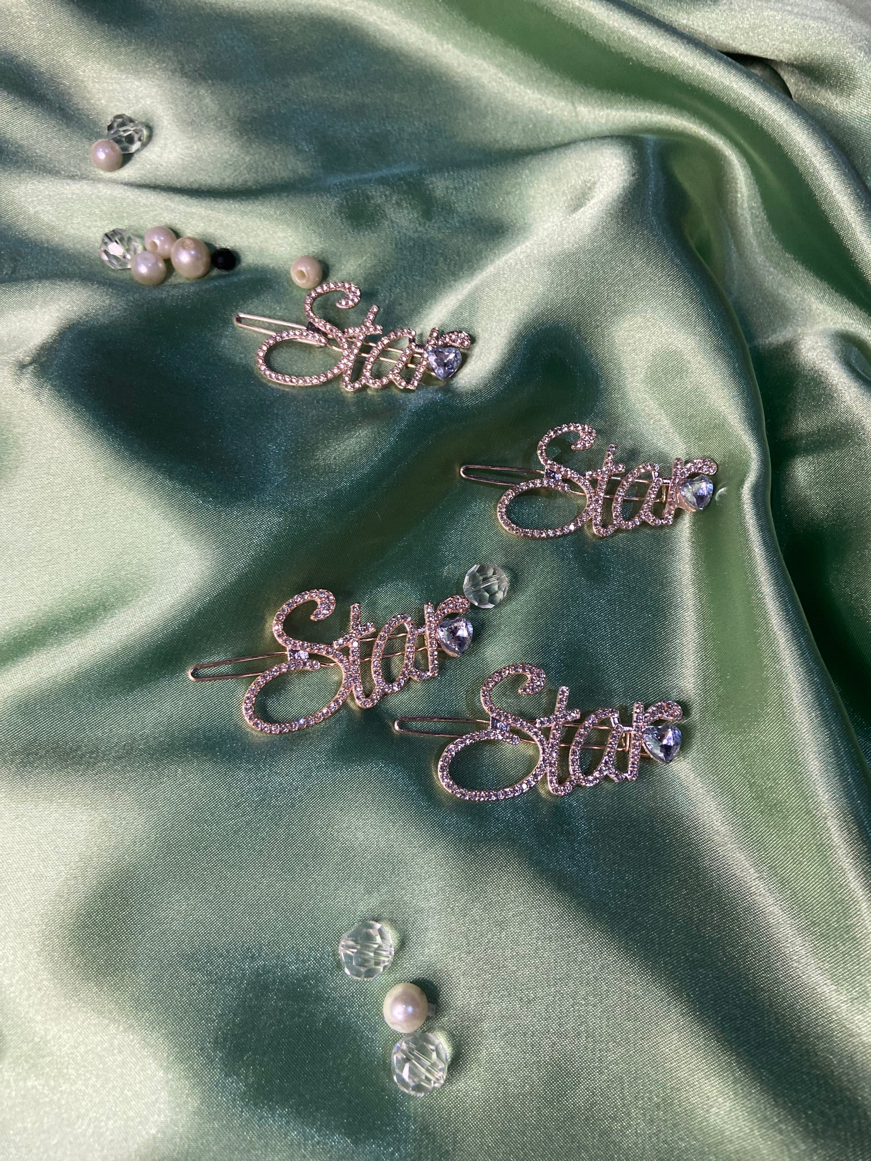 Make a glamorous statement with these sparkling "Star" crystal hair clips. Designed with sparkling rhinestones, these trendy clips feature the word "Star" adorned with brilliant crystals, making them the perfect accessory to add a touch of glamour to any hairstyle. Ideal for both casual wear and special occasions, these clips bring a unique sparkle to your look.