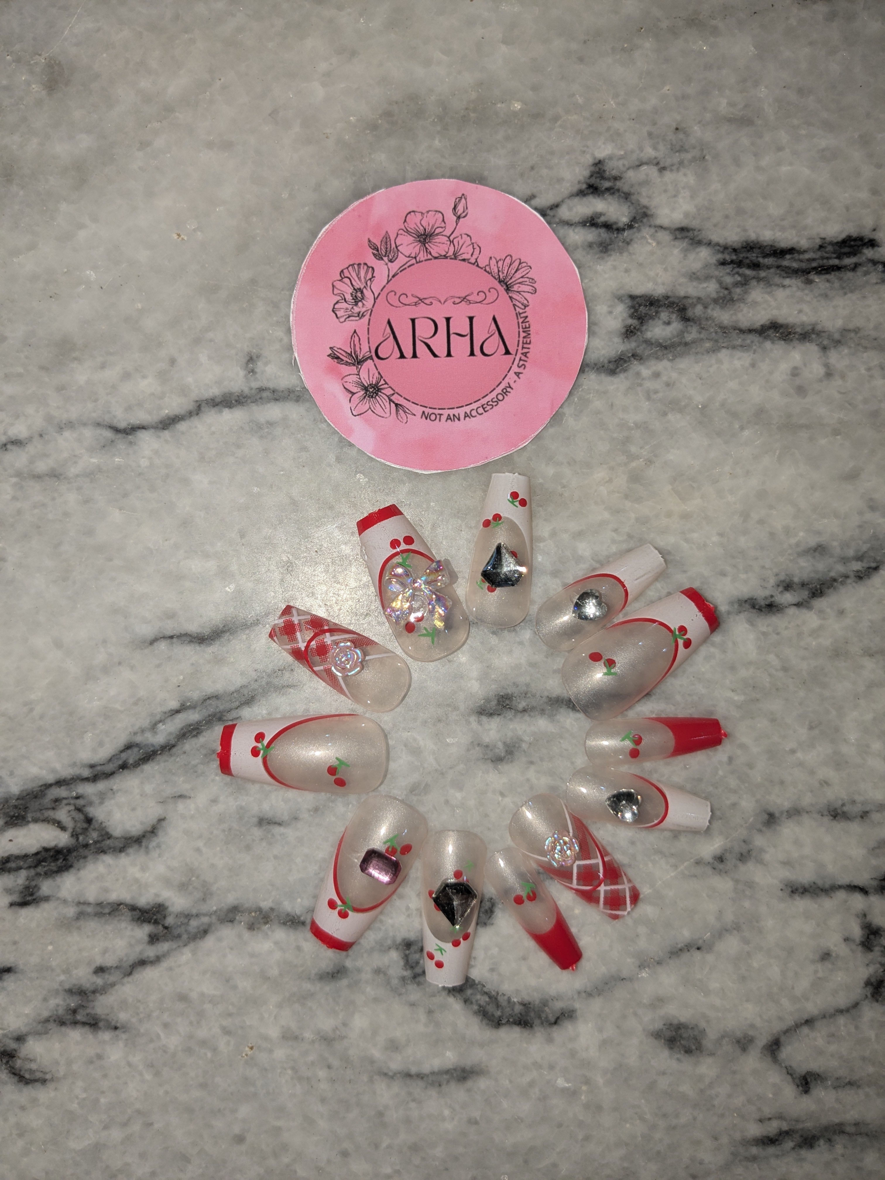 Indulge in ARHA's delightful press-on nails, featuring a crisp white base with vibrant red French tips and playful cherry and floral designs. Each nail is accented with sparkling rhinestones and delicate 3D elements for a touch of glamour. Perfect for a fun, fresh, and eye-catching manicure that makes a statement. Discover your perfect look with ARHA: "NOT AN ACCESSORY, IT'S A STATEMENT.