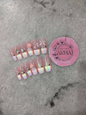 Discover ARHA's charming press-on nails featuring a delicate pink French tip, clear base, and adorable 3D embellishments including sparkling bows, sweet flowers, and dazzling rhinestones. These elegant and glamorous artificial nails are perfect for adding a touch of cuteness and sophistication to any look. Get a salon-quality manicure at home with ARHA: "NOT AN ACCESSORY, IT'S A STATEMENT."